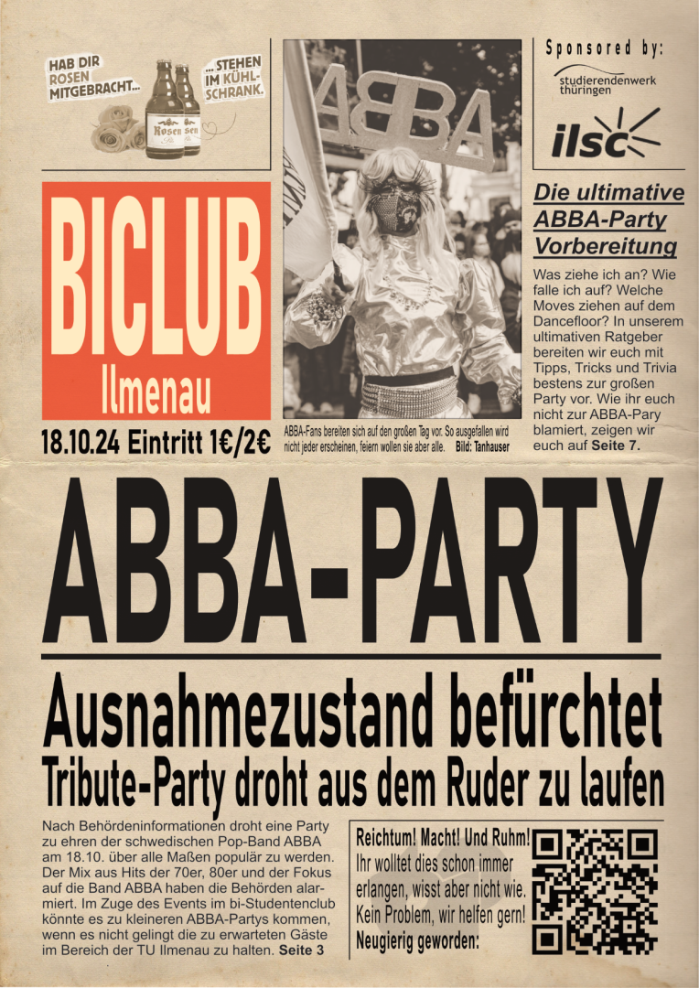 SOS! Eine ABBA-Party ist im anrollen. Am 18.10. feiern wir die schwedische Sensation ABBA bei uns im bi-Studentenclub. Lasst die Disco Zeit auferstehen, werdet zu Dancing Queen. Neben den größten Hits der Skandinavischen Band erwarten euch natürlich auch andere Große Hits aus den 70er und 80er Jahren. Mamma Mia.