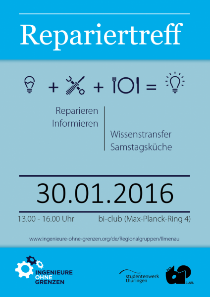 Zusätzlich zum leckeren Essen unserer Samstagsküche (Angebot ab Samstag hier und auf unserer Facebook-Seite) findet ihr heute Vertreter der Ingenieure ohne Grenzen im bi-Club, die wieder einmal zum Repariertreff einladen.