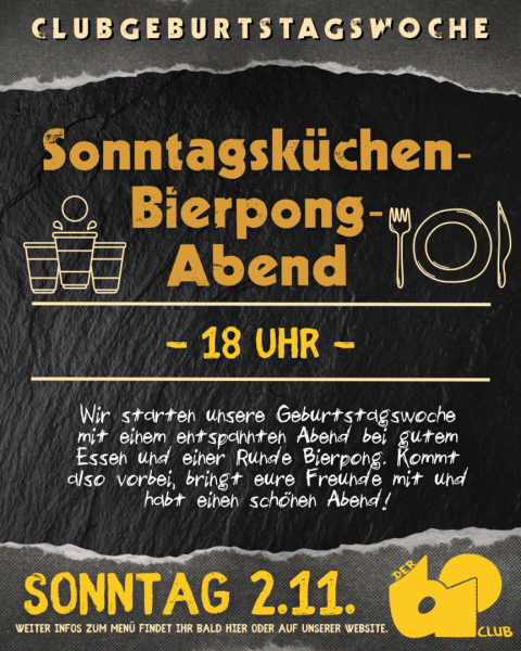 Wie jeden Sonntag gibt es bei uns einen entspannten Abend mit Essen und Platz, um mit euren Freunden oder neuen Bekannten zu spielen oder einfach nur zu quatschen. Das Besondere heute ist, dass wir mehrere Tische haben, an denen ihr gegeneinander Bierpong spielen könnt. Wenn ihr kein Bier mögt, könnt ihr euch natürlich auch alkoholfreie Getränke und Cocktails an der Bar besorgen.